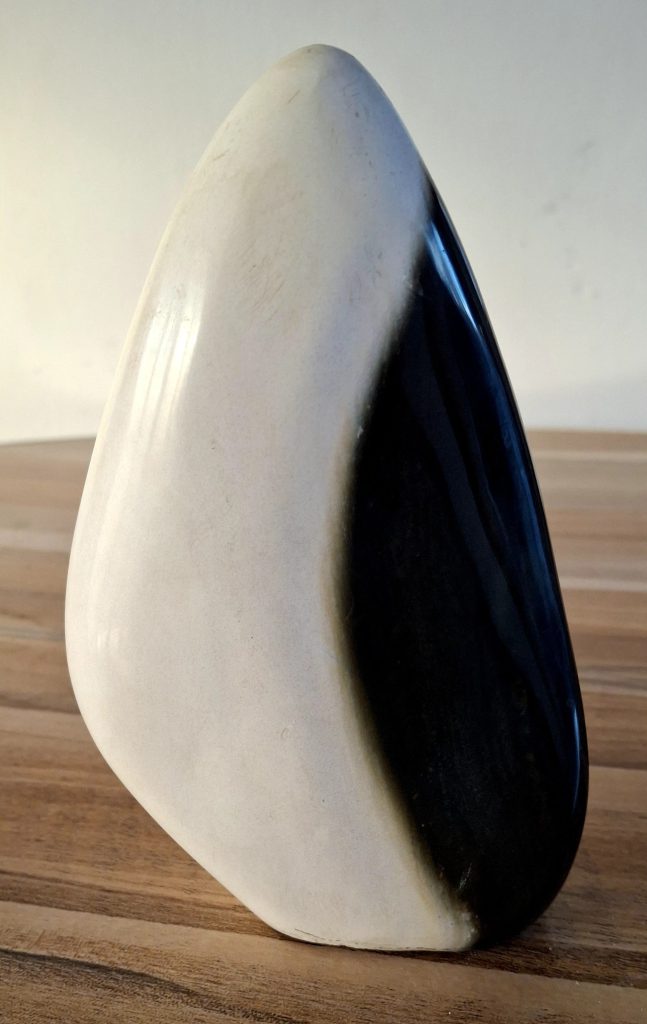 Cette sculpture contemporaine est taillée dans un Jaspe de Madagascar, révélant un contraste graphique époustouflant entre le blanc laiteux et le noir intense. La ligne de démarcation naturelle est mise en valeur par un polissage miroir, qui souligne les formes douces et organiques de l’objet.